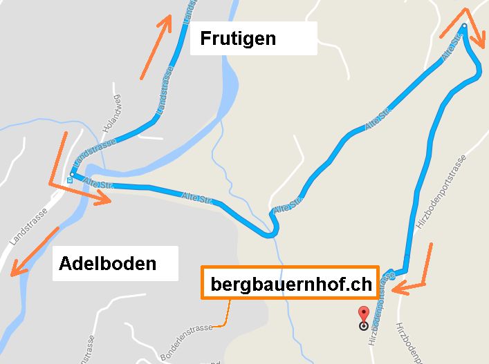"Landstrasse" folgen bis "Margeli" - Abzweigung und "Alte Strasse" 1200 m folgen - Abzweigung und "Hirzbodenportstrasse" 650 m folgen - Abzweigung und "Hirzbodenportstrasse" 180 m folgen bis Hausnummer 4.
