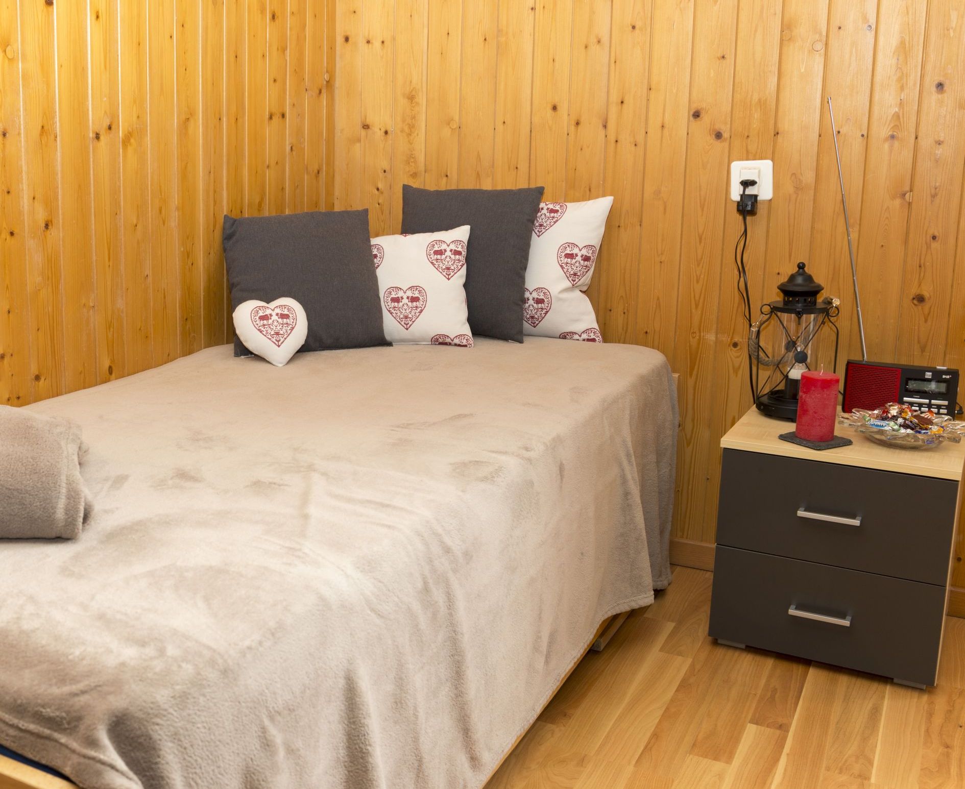 Sie besteht aus einer gemütlichen Wohnküche mit ausziehbarem Doppelbett sowie einem Schlafzimmer mit Doppelbett.